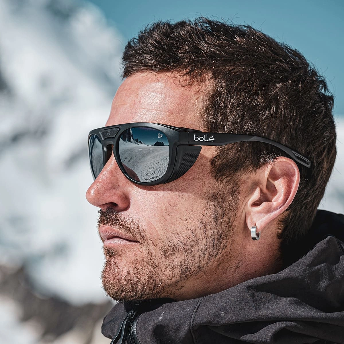 A vintage round mountain frame revisited with Bollé design language, the ADVENTURER is a symbol of the brand’s outdoors expertise. High performance and trendy, these base 8 glacier sunglasses are easy to wear and offer the highest protection for ultimate conditions. Comfort, fit, and stability are ensured thanks to the Thermogrip rubber on temple tips and on its adjustable 3-position nose piece. Removable side shields guarantee maximum light protection. The ADVENTURER leaves nothing to chance with its snap hinge, a hole for a cord included with the frame and its rubber front clip. Available with Phantom, the best photochromic lens in the market and Solace4, Bollé’s new mineral lens for the mountains.